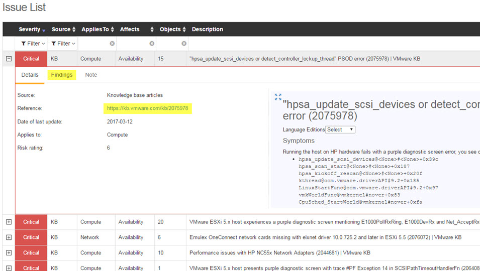 Then I moved to the Issues List which is nice as it color codes issues in different categories (critical, major, Medium and low). I am not 100% sure how these are calculated but they do align with how I generally look at issues within an environment. I also notice some really cool info around PSODs and how it relates to hardware drivers and firmware updates.
